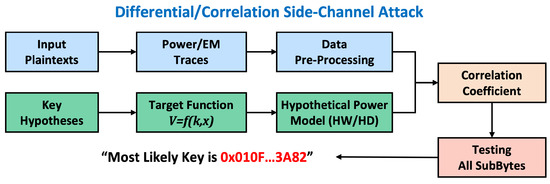 Figure 1. Overview of the differential/correlation-based side-channel attack. - Static Power Side-Channel Attacks: Static power side-channel attacks (S-PSCA) exploit the static power consumption of a device to extract sensitive information. Unlike dynamic power side-channel attacks, which focus on power consumption during active operations, S-PSCA analyzes the power consumption when the device is in a steady state. This can reveal information about the internal state of the device, such as values stored in registers or memory cells, potentially exposing cryptographic keys [2,14].