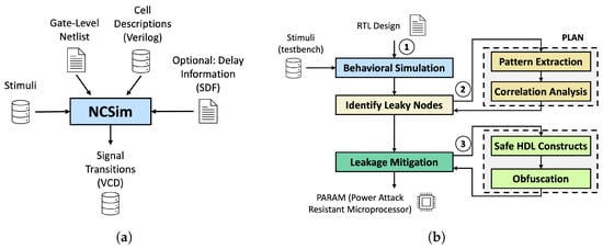 Figure 3. (a) Architecture of simulation environment using cadence NCSIM/Incisive [49], (b) Architecture of PLAN/PARAM leakage simulator [50].Another tool, PLAN/PARAM [50] (see Figure 3b), estimates power by aggregating consumption from all signals within a module. This method assumes the power consumption of a k-bit signal correlates with its Hamming weight. Evaluating the entire Shakti-C processor using PLAN/PARAM takes approximately 5 h, significantly faster than the month-long requirement for post-and-place route simulations. - Architecture Correlation Analysis (ACA) [51]: The growing complexity of contemporary systems, fueled by System-on-Chip (SoC) integration, complicates the task of accurately pinpointing the origins of side-channel leakage. Consequently, secure SoC designers are compelled to proactively deploy costly countermeasures to protect subsystems like encryption modules, leading to increased chip design expenses. To address this issue, a new methodology known as Architecture Correlation Analysis (ACA) [51] has been introduced, presented in Figure 4. ACA enables the accurate identification of side-channel leakage sources at the granularity of a single cell during the design phase. By leveraging a leakage model typically used in differential side-channel analysis techniques, ACA ranks cells within a netlist based on their individual contributions to side-channel leakage. This strategy allows designers to apply countermeasures selectively where they are most effective, thereby reducing the need for expensive blanket countermeasure application. The effectiveness of the ACA methodology is showcased through its application to an AES coprocessor within an SoC design. By employing ACA, researchers successfully pinpoint sources of side-channel leakage at both the gate level within the AES module and within the overarching SoC [51]. Moreover, the efficacy of ACA is confirmed through its integration into an optimized hiding countermeasure.
