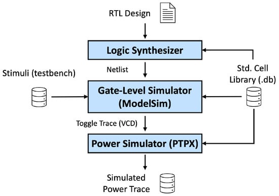 Figure 4. Simulation procedure of architecture correlation analysis (ACA) [51]. - RTL-PSC [7,41]: RTL-PSC [7,41] is one of the pioneers in RTL power side-channel evaluation of cryptographic cores, checking security vulnerabilities much earlier than the typical post-silicon evaluation in the entire development cycle. This method employs functional simulation at the RTL to estimate the power consumption profile of a hardware design, utilizing the Synopsys VCS tool to count transitions, as shown in Figure 5. RTL-PSC distinguishes itself from other methods with two notable advantages: precise quantitative analysis of power side-channel leakage and exceptional efficiency. For instance, the evaluation time for AES-GF is approximately 43.6 min, while for AES-LUT, it varies between 24 and 44 min [7]. In contrast, gate-level and layout-level evaluations would take approximately 31 h and over a month, respectively.
