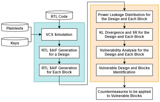 Figure 5. High-level flow of RTL power side-channel vulnerability assessment [7].More specifically, RTL-PSC aims at quantifying the RTL power side-channel leakage in terms of KL divergence. KL divergence, as detailed in Section 3.2.1, measures the statistical distance between two probabilistic distributions. As for RTL-PSC methodology evaluating side-channel leakage, the distributions are generated with the simulated design switching activities (toggle counts in dumped SAIF files) by fitting them into the Gaussian distribution model. For each set of switching activities, the security analyzer will pick a different cryptographic key with random plaintexts (messages). Given the huge search space of key guesses (e.g., full key guess of a typical AES-128 calls for which is computationally intractable), a critical assumption of RTL-PSC is the hamming distance between selected key values is positively correlated with the resulting leakage. As such, RTL-PSC can excel in conventional post-silicon methodology in assessing design vulnerabilities without sacrificing accuracy while preserving the maximum flexibility in countermeasure deployment [7]. - PSC-TG [40]: The PSC-TG framework [40] represents an innovative approach for predicting power side-channel leakage at the RTL. This method enhances flexibility in implementing countermeasures against power side-channel attacks (SCAs), which exploit cryptographic implementation leaks to extract sensitive information. Unlike many existing techniques focused on post-silicon stages, PSC-TG initiates with RTL information flow tracking to pinpoint the most vulnerable variables. Formal assertions are then developed based on these variables and an assumed attack model to generate test patterns [32,40]. The side-channel vulnerability (SCV) metric is derived from estimated power using as few as two patterns, quantifying initial side-channel leakage. For higher-order assessments in masked implementations, PSC-TG employs a t-test to provide a pass/fail outcome [40]. Experimental evaluations across RTL, gate-level, and FPGA implementations validated PSC-TG’s efficacy. Specifically, t-test results for masked Simon implementations aligned closely with post-silicon findings.