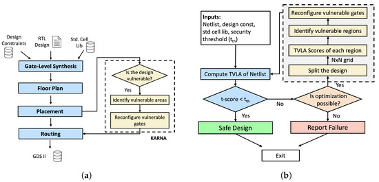 Figure 6. (a) Overview of Karna framework integration into the standard EDA flow, (b) Leakage verification and mitigation using KARNA [53].The verification and mitigation flow of Karna has been seamlessly integrated into the Synopsys Design Compiler. Its effectiveness is demonstrated through significant reductions in side-channel leakage in implementations of AES, PRESENT, and Simon block ciphers synthesized for a 28 nm technology node. Remarkably, Karna achieves these enhancements by optimizing the available space around existing gates, thereby avoiding any additional area overheads. The authors validated the improved side-channel resilience of these optimized designs against Differential Power Analysis attacks [53]. This approach successfully mitigates power side-channel vulnerabilities without introducing delays, increasing power consumption, or escalating gate counts, underscoring Karna’s potential as a pivotal tool for enhancing device security.