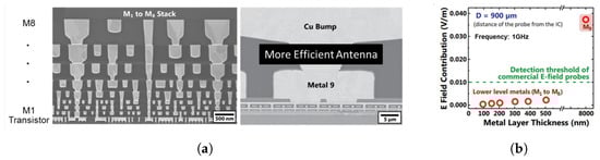 - White-Box Analysis [54,55]: Electromagnetic emissions in integrated circuits (ICs), caused by data-dependent current consumption passing through different metal layer interconnects, pose a significant security risk. In response to the growing threat of EM side-channel attacks on internet-connected devices, a novel approach called STELLAR has been introduced [54,55]. STELLAR provides a detailed analysis of the EM leakage in the context of side-channel security, focusing on its origin within CMOS-based ICs. The study reveals that EM radiation primarily stems from the metal layer routings within CMOS integrated circuits. Simulations are employed to explore the contributions of individual metal layers to the radiated electric field (E-field), demonstrating that the highest metal layers, such as Metal 9 (M9), play a significant role in EM radiation, illustrated in Figure 7. Commercially available E-field probes are used to assess the sensitivity and detectability of the EM leakage from different metal layers. The results show that for the specific example of Intel’s 32 nm technology, the radiation from M9 can be detected, while lower-level metal layers do not exceed the detection threshold of E-field probes. This underscores the importance of minimizing EM radiation from top-level metal layers and provides insights into designing countermeasures against EM side-channel attacks [54,55].