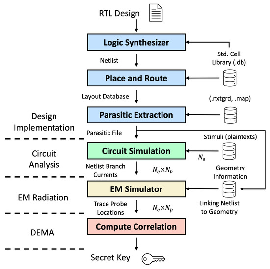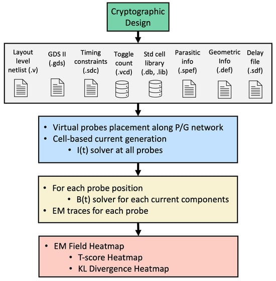 Figure 8. Efficient EM side-channel vulnerability simulation flow at layout level [56].The circuit analysis step involves acquiring critical traces using industry-standard CAD tools, focusing on high-accuracy transient-circuit simulations exclusively during the cipher-execution phase. A hybrid approach that combines gate-level and transistor-level simulations is proposed, with transistor-level simulations using SPICE reserved for the critical last round. Model simplification aims to mitigate computational complexity by restricting the simulation of radiation to a reduced set of currents, specifically focusing on currents within the top metallization layers of the on-chip power-delivery network. The EM radiation step calculates the transient fields that would be received by a probe at different positions near the chip’s surface, given the distribution of transient currents on the chip. EM traces are generated for various probe positions, orientations, and times. This step entails substantial computational complexity but can be effectively parallelized to reduce simulation times [56,59].The proposed simulation flow, applied to an AES ASIC implementation, provides insights into electromagnetic side-channel attacks (EM SCA). The process involves circuit analysis for 5000 different encryptions and EM simulations. The analysis shows that probe proximity and noise significantly influence attack success. Furthermore, early-stage design choices, particularly the on-chip power distribution network design, can impact EM attack vulnerability. These findings emphasize the need for careful consideration during implementation [56,59]. - Multi-Physics EM Simulation [57]: Lin et al. [57] present an innovative pre-silicon EM side-channel simulation framework, illustrated in Figure 9, with three key contributions. Firstly, it provides an efficient pre-silicon EM side-channel simulation method powered by a machine learning-driven auto-Point-of-Interest (POI) detection algorithm. Secondly, the framework’s accuracy is validated using a 130 nm AES128 test chip, effectively identifying EM leakage locations and the number of traces required for complete key disclosure. Lastly, the framework demonstrates versatility by handling EM leakage simulations from both the front and back sides of a design. The study identifies unexpected power ring structure leakage as a significant source of data exposure from the substrate side, endorsing the value of the auto-POI approach in guiding EM measurements [57].