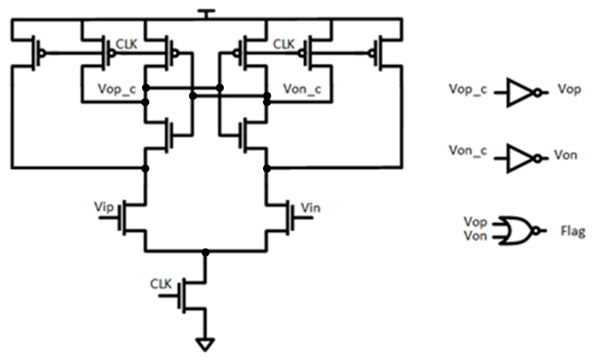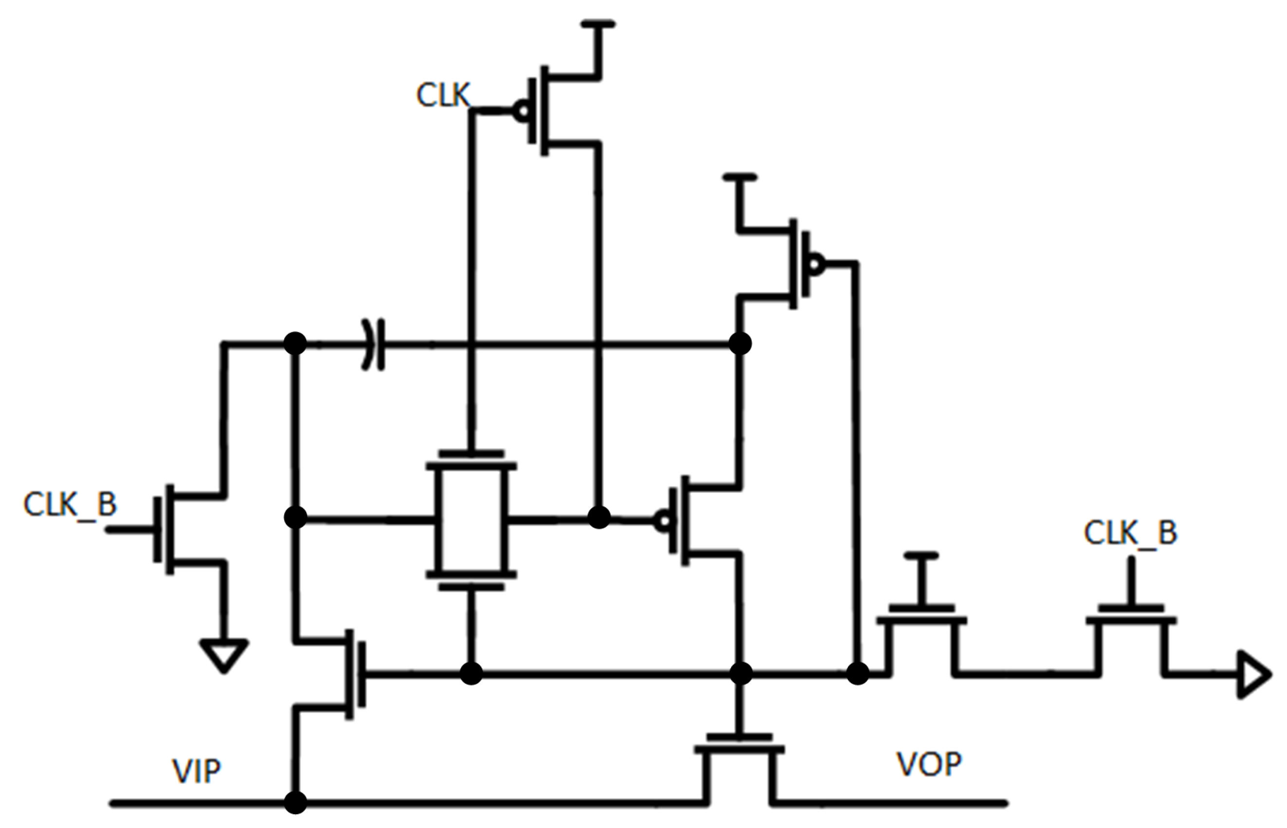 . When the clock transitions, the differential input voltage is amplified by the input pair, and positive feedback rapidly resolves the output to a full-swing digital level. The comparator’s gain phase lasts approximately 20% of the conversion cycle, with a simulated propagation delay of less than 60 ps for a 100 µV input at worst-case corners.