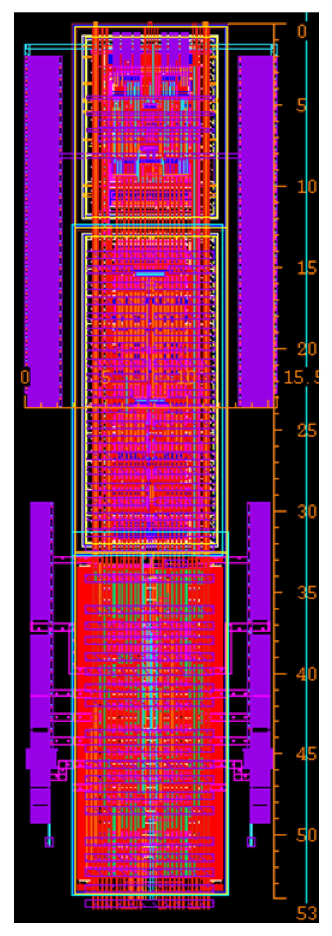 m), whereas the bulk of the layout in the center focuses on the individual circuit blocks within the architecture.