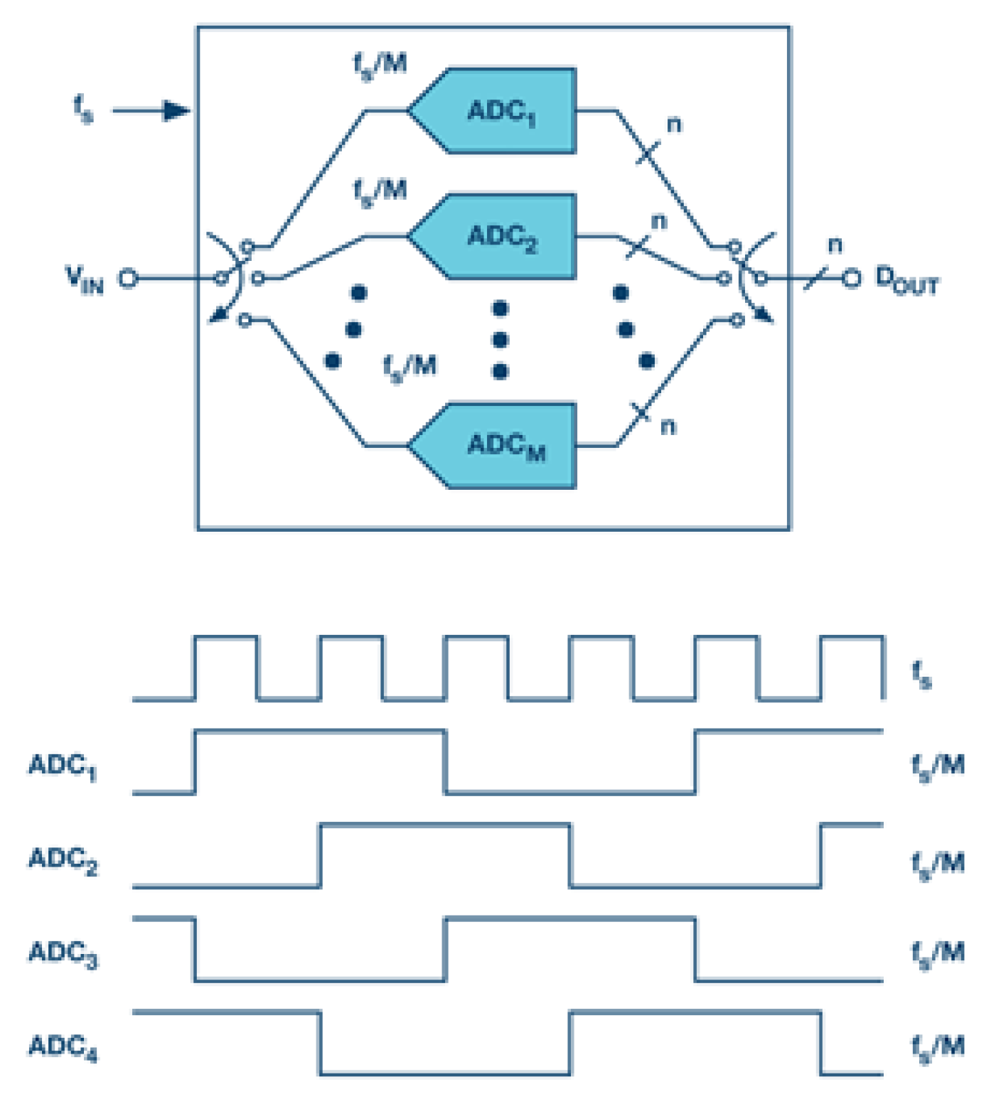 Figure 10 for an example). This approach increases the effective sampling rate while maintaining the power and area efficiency of each individual converter. For this ADC design, the designers used two channels in parallel, with the effective sampling rate being 810 MS/s for the system with each parallel ADC operating at 405 MS/s.