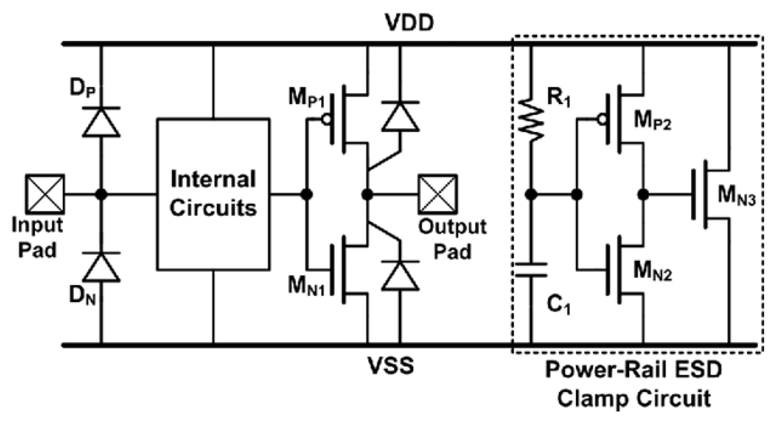 - Ker, M.D.; Chang, W.J.; Wang, C.T.; Chen, W.Y. ESD Protection for Mixed-Voltage I/O in LowVoltage Thin-Oxide CMOS. In Proceedings of the 2006 IEEE International Solid State Circuits Conference—Digest of Technical Papers, San Francisco, CA, USA, 6–9 February 2006; pp. 2230–2237. [Google Scholar] [CrossRef]