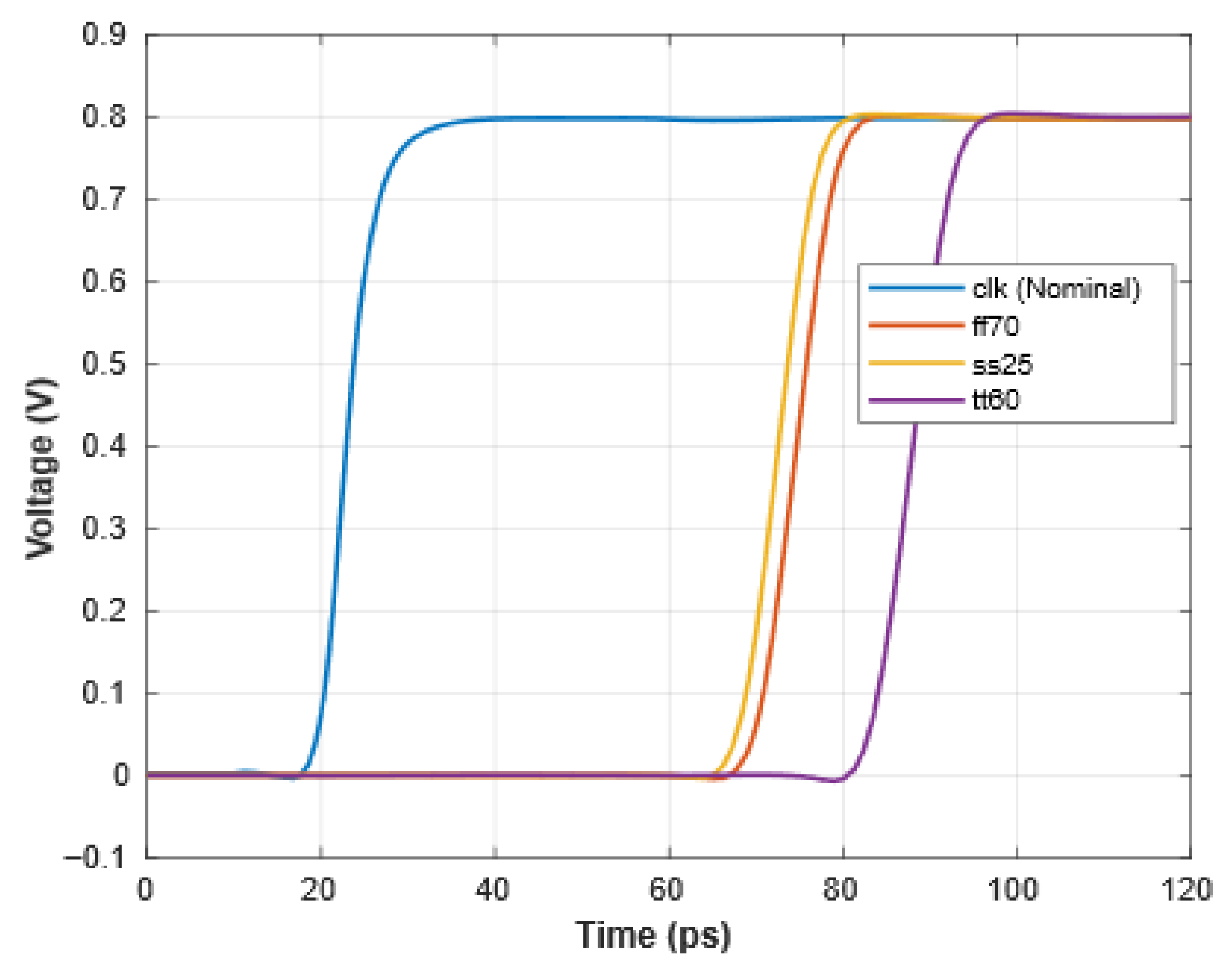 Simulations targeted the typical–typical (tt) process corner at 60 °C, representative of co-location with high-power digital cores. Additional corners, such as slow–slow at −40 °C, were used to evaluate robustness across process–voltage–temperature (PVT) variations. Monte Carlo simulations with post-layout parasitic extraction were used to estimate yield.
