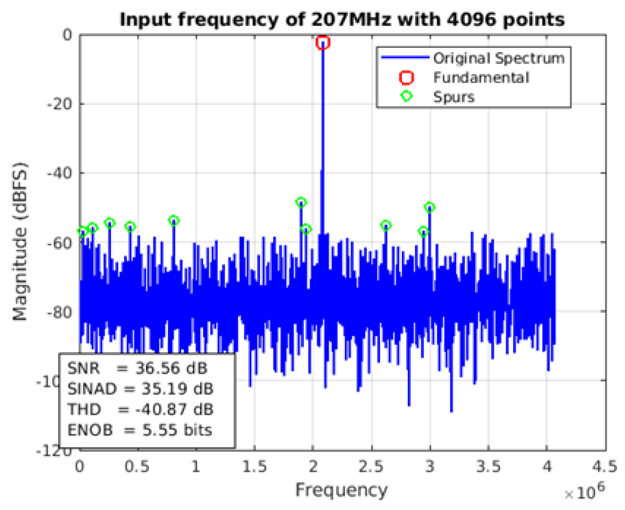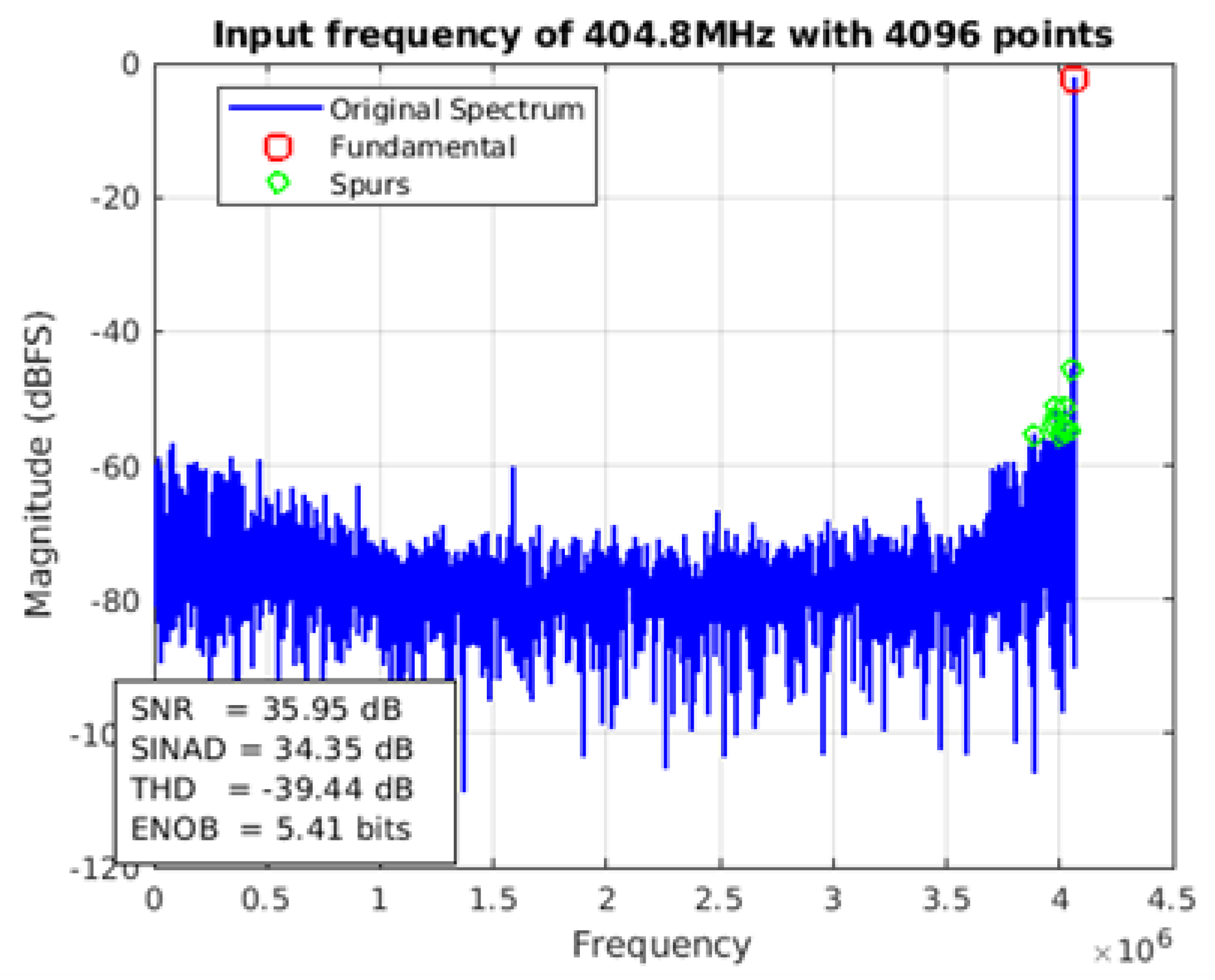 FFT-based analysis was used to evaluate dynamic performance. The converter achieved a SINAD of approximately 38 dB at the Nyquist input, corresponding to an ENOB of 6.1 bits.