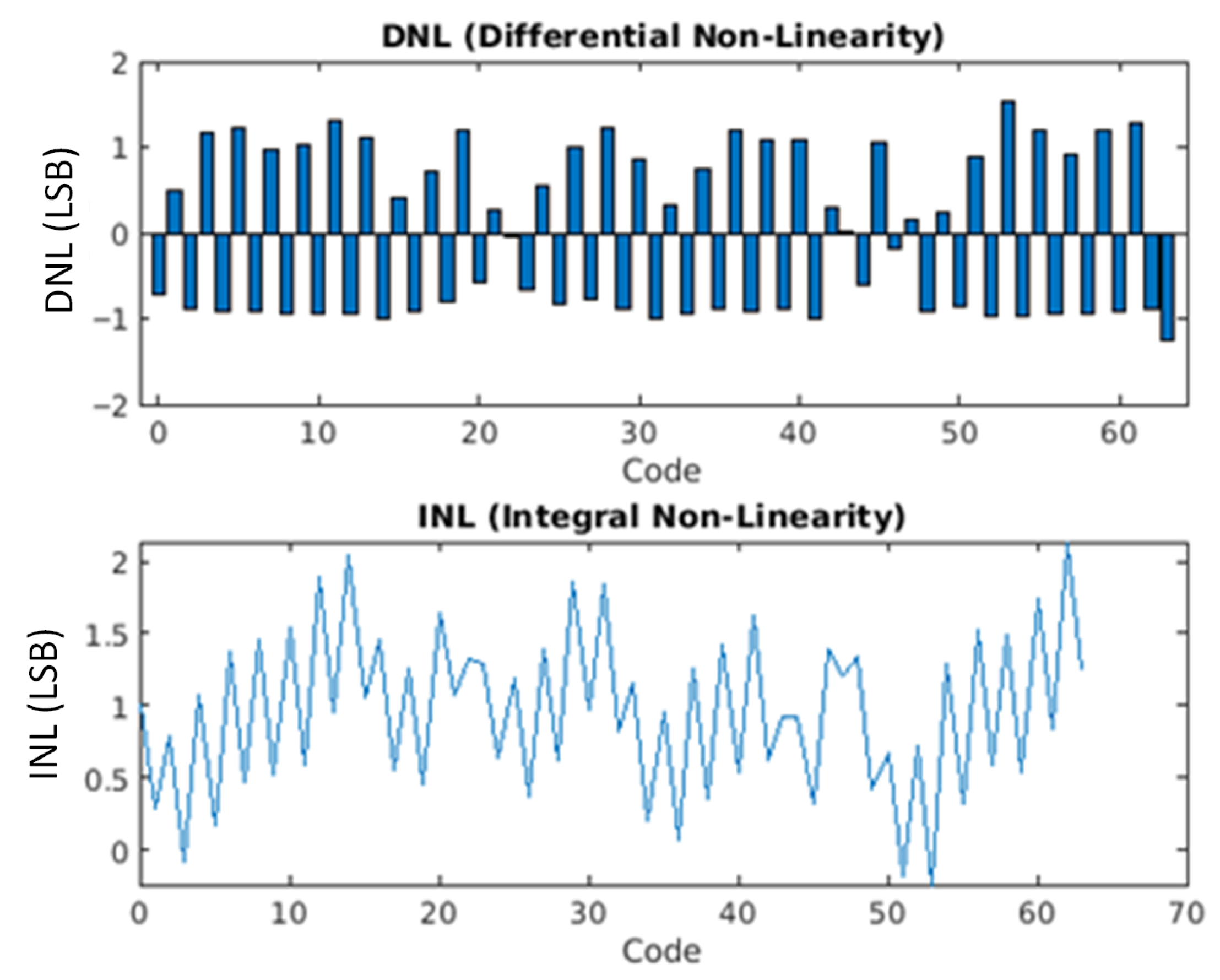 The converter’s DC transfer function exhibited expected stair-step behavior. However, the integral and differential nonlinearity (INL/DNL) was higher than expected (shown in
