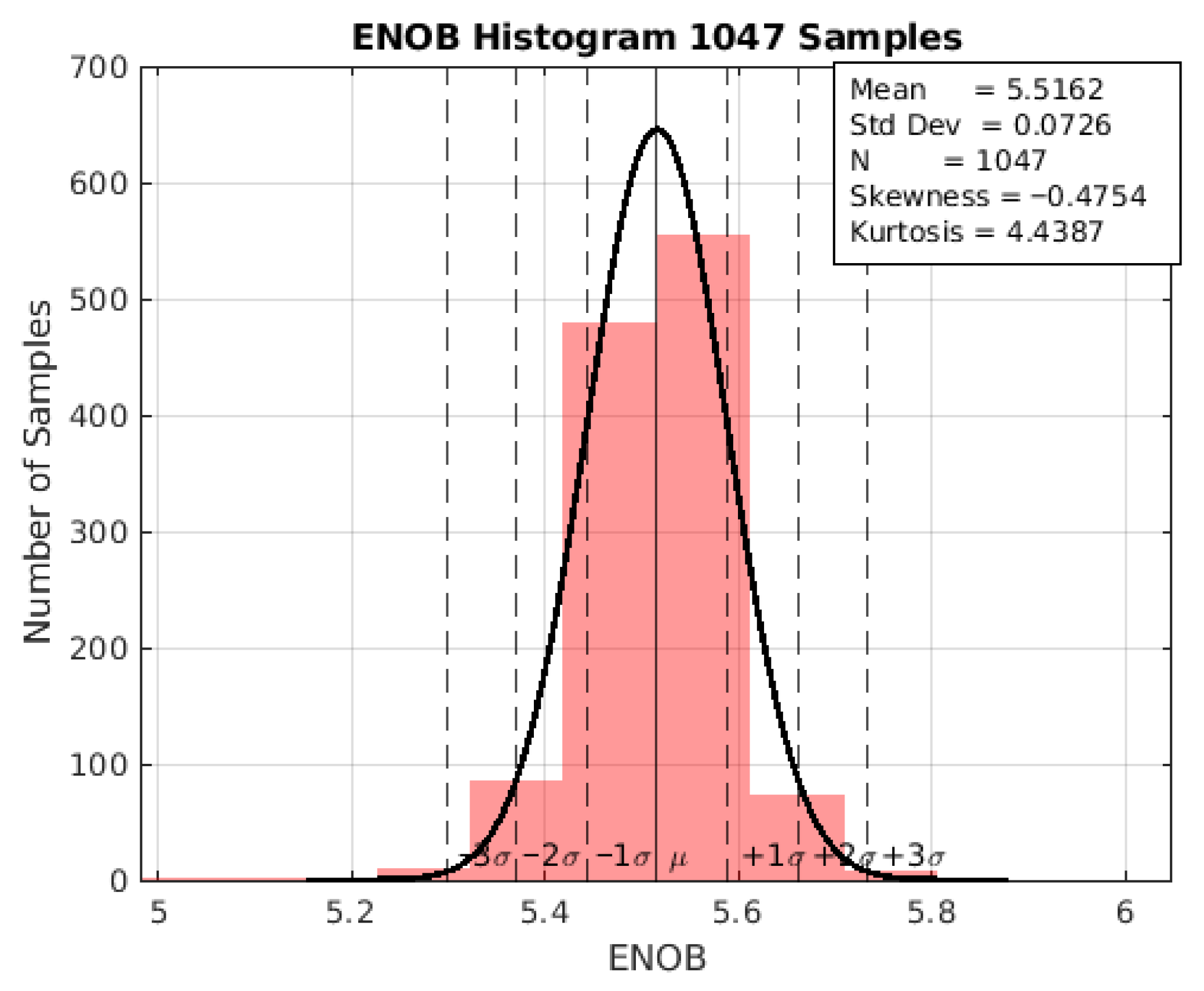 Monte Carlo simulations with mismatch models and parasitic extraction showed that the converter met the ENOB target with one standard deviation margin, which is shown in