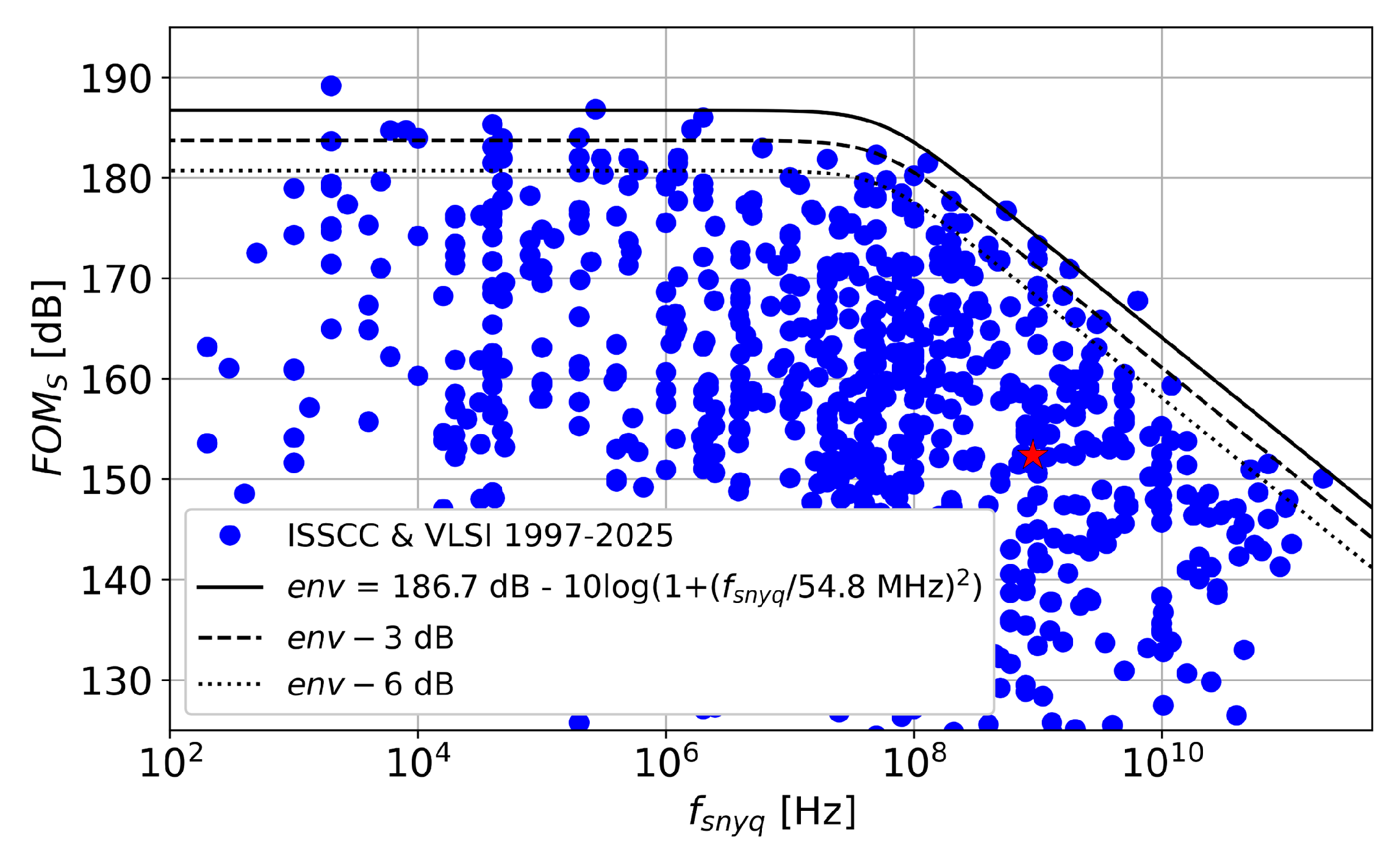 In summary, this SAR ADC contributes to the growing body of work supporting digitally assisted, interleaved ADC architectures for next-generation communication systems. Future work will focus on improving linearity, implementing digital calibration, and exploring advanced switching schemes to further enhance performance and scalability, with the aim of moving the red star in