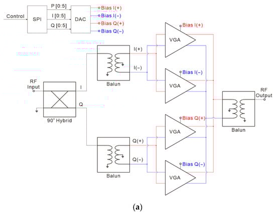 The remainder of this paper is organized as follows. Section 2 describes the structure and operation of the VGA unit used to implement the two types of VSPSs. Section 3 presents the design methodology of the VSPS based on the proposed VGA, including the signal distribution and combination networks such as the balun and 90° hybrid coupler. Section 4 compares and analyzes the simulation results of the two phase shifters.