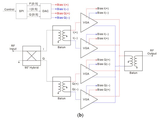 The VSPS method decomposes the input signal into four components, separated by 90°: in-phase plus (I+), in-phase minus (I−), quadrature plus (Q+), and quadrature minus (Q−). Then, the magnitude of each signal is amplified or attenuated using a VGA or Variable Attenuator, and the signals are combined to realize phase shifting. The operation principle is illustrated in Figure 1a,b.