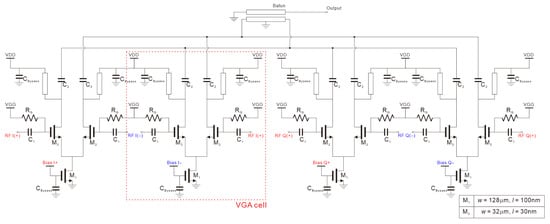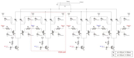 Figure 2 illustrates the in-phase section of the Gilbert cell-based VGA only. Bias I+ and Bias I−, converted into voltage levels by the current DAC, are applied to the gate of the M1 transistor and function as tail current sources []. By controlling the current of each tail branch through the DAC, the total output current remains constant. As a result, even if the gain of each node varies, the impedance of the output stage remains nearly constant.