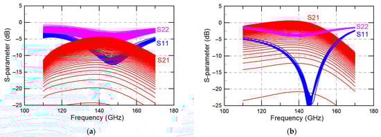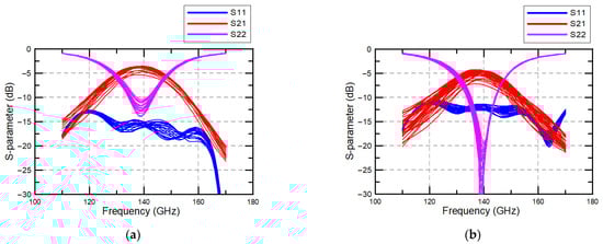 The sensitivity of the gain to bias voltage variations in the proposed circuit was analyzed through layout simulations. For the 150 GHz Gilbert cell-based phase shifter, the variation in S21 with respect to the VDD was very small, within approximately 0.002 dB/mV (VDD = 0.8–1.5 V). The gain variation with respect to the VGG was also low, about 0.001 dB/mV at a VGG = 0.8 V, indicating that high precision in the bias setting is not required. However, due to transistor limitations, VDD = 1.0 V and VGG = 0.8 V were used. For the 140 GHz current-steering phase shifter, the gain variation with the VDD was similarly small, but it exhibited a relatively higher sensitivity to the VGG. At the point where the gain reaches its maximum, S21 decreased by approximately 0.2 dB when the VGG varied by 50 mV. Therefore, to maintain optimal gain performance, the VGG bias voltage must be precisely adjusted. Considering the potential voltage drop caused by parasitic resistance rather than the voltage increase, the circuit was operated with a VDD = 1.3 V and a VGG = 0.57 V.