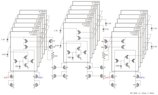 The DAC controlling each VGA in the phase shifter was implemented as a current-steering DAC. The basic architecture was adopted from a previously published VSPS design [,], while the transistor widths and lengths were optimized and modified to suit the 28 nm CMOS process. The applied digital control signals were converted into complementary logic levels through inverters to generate differential currents. These currents, produced by unit cells composed of transistors with scaled W/L ratios (×1, ×2, …, ×32), were summed to control both the phase and gain. The DAC receives 18-bit digital inputs: P [0:5], I [0:5], and Q [0:5] [,]. This 18-bit bus was mapped to an effective 13-bit control scheme. The eight bits for the phase control were composed of the six-bit P [0:5] for fine-tuning and two bits (derived from the I/Q buses) for quadrant selection. The five bits for gain control were implemented by sharing the remaining bits on the I and Q buses. As a result, the total number of effective control bits was 13, and 8192 simulation cases were generated, which are described in Section 4.