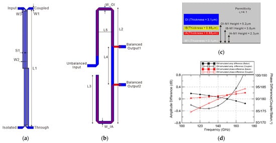 The baluns in Figure 1 are implemented as Marchand baluns using OI and IA layers, as shown in Figure 6b,c, and Table 1. Simulation results in Figure 6d indicate a phase difference of 180.3–182.5° and a maximum magnitude imbalance of 0.2 dB across the 110–170 GHz band. While an additional matching network is required to interface the baluns with the VGAs, this configuration offers broadband performance and structural simplicity, making it a suitable choice for the proposed design [].