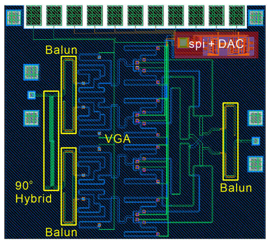The circuits described above were combined to implement two simulated phase shifters. An I/Q generator was realized using one Lange coupler and two baluns, providing four signals to four VGAs. The bias inputs of the amplifiers were controlled by an 18-bit DAC model in simulation, which converts the digital control words into analog bias voltages for each VGA. Figure 7 shows the layout of the complete phase shifter circuit.