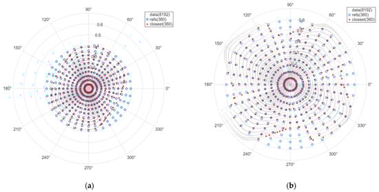 Based on the circuits described in Section 2 and Section 3, two phase shifters were implemented with different VGA designs. The simulation results are summarized in Figure 8 and Figure 9. Figure 8 shows polar plots obtained using 5-bit gain and 8-bit phase control. A total of 8192 simulated data points are shown in gray, with reference points at 10° intervals in blue, and the points closest to the references highlighted in red. The Gilbert cell-based phase shifter (Figure 8a) exhibited a maximum gain of −9.5 dB, whereas the current-steering phase shifter (Figure 8b) achieved −5.1 dB. Although the current-steering phase shifter is expected to achieve −3.7 dB with DAC or VGA optimization, the present setup yields −5.1 dB due to coarse phase intervals and magnitude errors.