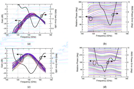 (a) Simulated gain and RMS gain error of the Gilbert cell-based phase shifter. (b) Simulated relative phase of 36 states and RMS phase error of the Gilbert cell-based phase shifter. (c) Simulated gain and RMS gain error of the current-steering phase shifter. (d) Simulated relative phase of 36 states and RMS phase error of the current-steering phase shifter.