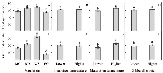 The WS population produced seeds with the fastest germination rate, whereas the FG population produced seeds with the slowest germination rate. The RD and MC populations showed the second and third lowest germination rates, respectively (Figure 2E). Seeds that matured under higher temperatures showed faster germination rates than seeds that matured under lower temperatures, as was similar to total germination (Figure 2G). Seed germination rate was significantly affected by P, M, G, the two-way interactions of P × I, P × M, and P × G, the three-way interactions of P × I × M, P × I × G, and I × M × G, and the four-way interaction of these factors (Table 3). On the basis of the four-way interaction, seeds of the WS population (treated with higher GA3 level) that matured at higher temperatures and were incubated under higher temperatures had the fastest germination rate (39.42 ± 4.96), whereas seeds of the FG population (treated with higher GA3 level) that matured under higher temperatures and were incubated under lower temperatures had the slowest germination rate (5.18 ± 3.46).