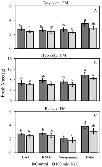 Fresh Mass (FM) of the: (A) cotyledon; (B) hypocotyl; and (C) radicle, (mean ± SE, n = 4), of BB lettuce, non-primed and seed-primed with GA3, KNO3, and hydro-priming, and further subjected to 100 mM of NaCl salt stress. 0 mM NaCl was considered as a control. Bars marked with different lowercase letters indicate statistically significant difference using Tukey’s honestly difference test at α = 0.05.