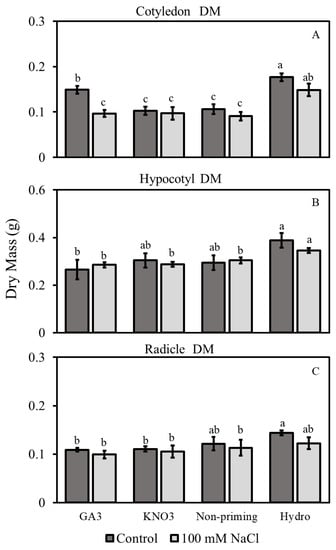 Dry Mass (DM) of the: (A) cotyledon; (B) hypocotyl; and (C) radicle (mean ± SE, n = 4) of BB lettuce, non-primed and seed-primed with GA3, KNO3, and hydro-priming, and further subjected to 100 mM of NaCl salt stress. 0 mM NaCl was considered as a control. Bars marked with different lowercase letters indicate statistically significant difference using Tukey’s honestly difference test at α = 0.05.