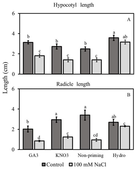 Length of: (A) hypocotyl; and (B) radicle, (mean ± SE, n = 4) of BB lettuce, non-primed and seed-primed with GA3, KNO3, and hydro-priming, and further subjected to 100 mM of NaCl salt stress. 0 mM NaCl was considered as a control. Bars marked with different lowercase letters indicate statistically significant difference using Tukey’s honestly difference test at α = 0.05.