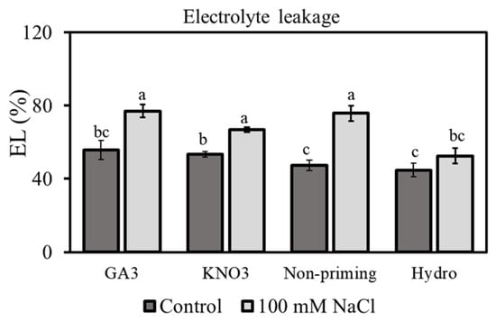 The membrane injury (EL) was noticeably increased in lettuce primed with GA3, KNO3, and NP subjected to 100 mM NaCl compared to the control, except for HP lettuce (Figure 4). The increase in EL by 38%, 25%, and 60% was recorded in GA3, KNO3, and NP lettuce, respectively, under SS compared to the control. However, there was no significant membrane damage caused in HP lettuce. Salt-treated HP lettuce reflected the lowest EL compared to other salt-treated primed lettuce.