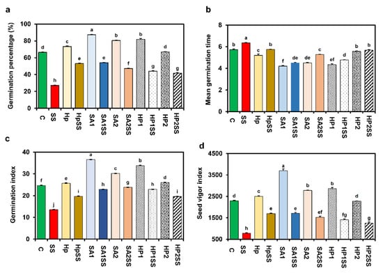 Effects of SA-, H2O2-, and hydro-priming on the germination indices of kidney bean under salt stress. (a) Germination percentage; (b) mean germination time; (c) germination index; (d) seed vigor index. The error bar represents standard error. Different letters among treatments were analyzed by Tukey’s test: p < 0.05.