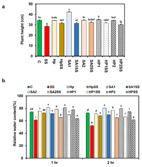 Effects of SA-, H2O2-, and hydro-priming on the plant height and relative water content of kidney beans under salt stress. (a) Plant height; (b) relative water content. The error bar represents the standard error. Different letters among treatments were analyzed by Tukey’s test: p < 0.05.