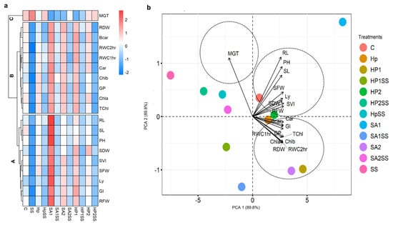 The mean values of germination indices, seedling traits, and physiological parameters were used to create a heatmap with hierarchical clustering and PCA (Figure 4). Three clusters (Cluster-A, -B, and -C) were found in the variable axis from the hierarchical clustering (Figure 4a). Cluster-A concerns RWC, GI, lycopene (Ly), SFW, SVI, SDW, plant height (PH), SL, and RL. Cluster-A parameters displayed decreasing trends in SS conditions and increasing trends in Hp, HpSS, SA1, SA1SS, SA2, SA2SS, HP1, HP1SS, HP2, and HP2SS conditions. Cluster-B includes the total Chl (TChl), Chl a, Chl b, GP, carotenoid (Car), RWC, beta-carotenoid (Bcar), and RDW. Similar to cluster-A, cluster-B parameters exhibited decreasing trends in SS conditions and increasing trends in other conditions. The variable MGT was clustered in the C group. The PCA components showed PCA 1 (89.8%) and PCA 2 (89.8%) data variability (Figure 4b). The PCA illustrated that cluster-A and B variables are closely associated with different treating conditions, whereas cluster-c was associated with the SS condition.
