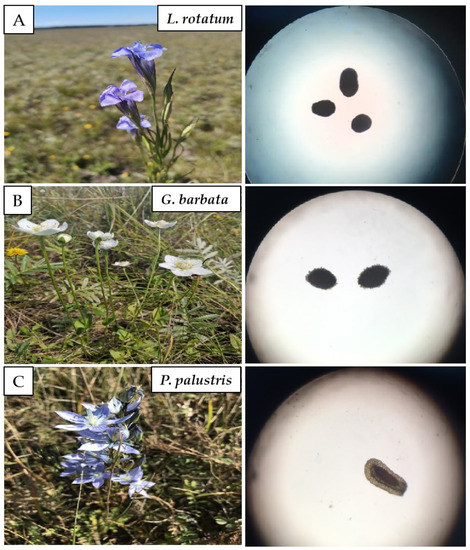 Herba Swertiae is a genus of widely used medicinal herb in Traditional Mongolian Medicine (TMM), which has a cold nature, and the taste is extremely bitter. Herba Swertiae has a significant importance in clinical therapy, with notable actions of heat-clear and detoxication effects [1,2]. It has been used as the main composition or in combination with other medicinal herbs to prescribe various TMM formulas, such as swertiae-4 decoction, swertiae-8 decoction, and swertiae-10 powder. In TMM clinical practice, these traditional formulae are mainly used to treat jaundice hepatitis, acute enteritis, dysentery, cholecystitis, and pneumonia [3,4,5,6]. Thus, this genus of medicinal herbs has contributed significantly toward TMM medical treatment and the healthy careers of Mongolian nomads. In this study, we mainly focus on the following three TMM medicinal herbs of Herba Swertiae: Lomatogonium rotatum (L.) Fries ex Nym (L. rotatum), Gentianopsis barbata (Froel.) Ma., (G. barbata), and Parnassis palustris L. (P. palustris) to investigate their morphological characteristics and suitable germination conditions. At present, all Herba Swertiae species utilized in manufacturing are collected from wild plants. Because the entire grass is used as medicine, harvesters frequently remove the entire plant during the flowering stage, and the majority of the remaining plants are removed together with the grass when the seeds are immature and the grass is weeded in mid-August on the grassland. There are only a few plant materials surviving on the meadow afterwards. Therefore, artificial domestication has become the primary means of protecting and supplying medicinal resources from the wild.