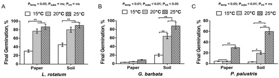 Seed germination response to various temperatures in L. rotatum (A), G. barbata (B), and P. palustris (C). The vertical lines indicate the standard error of the mean (±SEM). * p < 0.05, ** p < 0.01.