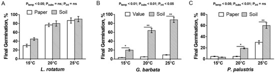 As shown in Figure 4, the germination percentage of G. barbata on the soil substrate was significantly higher than that on filter paper at three temperature gradients, and the highest germination percentage could be up to 90%, while the germination of L. rotatum on these two substrates did not change significantly. In addition, the germination percentage of P. palustris had no significant difference in the two substrates at low temperature (15 °C), but showed a significant difference at 20 °C and 25 °C. In contrast to L. rotatum and P. palustris, a significant interaction effect was found between temperature and substrate effects on the germination percentage of G. barbata (Figure 3 and Figure 4).