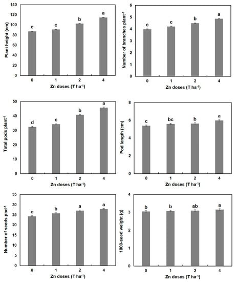 Zn’s impact on plant height, branches plant−1, pods plant−1, pod length, seeds pods−1 and 1000-seed weight of Mustard. Figures with same letter (s) do not differ significantly, whereas figures with dissimilar letters differ significantly as per DMRT.