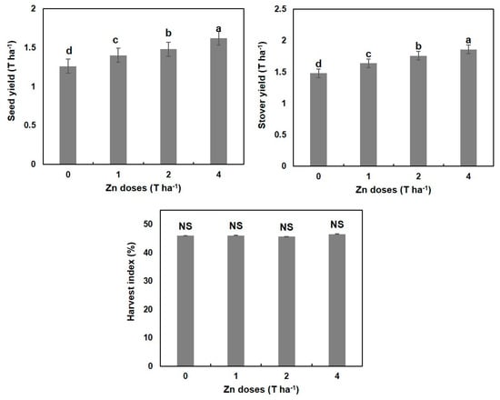 Zn’s impact on Seed and Stover Yield, Harvest Index of Mustard. Figures with same letter (s) or without letter do not differ significantly, whereas figures with dissimilar letters differ significantly as per DMRT. NS = Not significant.