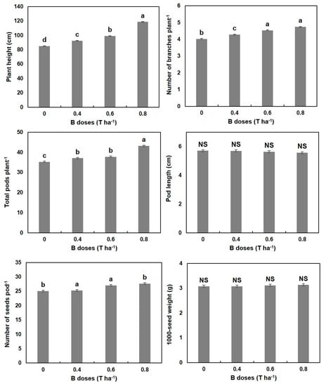 With the exception of the pod length and 1000-seed weight, the varying doses of B had an impact on the mustard crop and yield-contributing traits (Figure 3). The 0.8 kg of B ha−1 dose yielded the tallest plant (118.7 cm), and the control treatment produced the shortest (85.15 cm) (Figure 3). The plots that received 0.8 kg of B ha−1 treatment had the maximum numbers of branches plant−1 (4.74), total pods plant−1 (43.20), and seeds pod−1 (27.62). The number of branches plant−1 (4.02), pods plant−1 (35.31), and seeds pod−1 (25.09) found in the control (0 kg B ha−1) were the lowest. Boron was found to be non-significant for the pod length and 1000-seed weight (Figure 3).