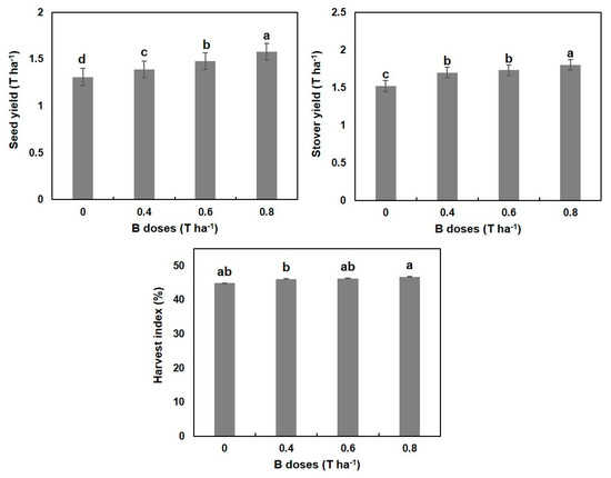 The yield and the harvest index of mustard were influenced significantly by various B dosages (Figure 4). In plots treated with 0.8 kg of B ha−1, followed by 0.6 kg of B ha−1, the maximum seed (1.58 T ha−1) and stover yield (1.80 T ha−1) were attained. As opposed to that, the control boron treatment produced the lowest seed (1.31 T ha−1) and stover yield (1.52 T ha−1). The harvest index was highest (46.75%) for boron at 0.8 of kg ha−1 and lowest for the control (44.98%) treatment (Figure 4).