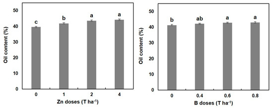 Figure 5 displays the results for how varying the Zn and B levels affects the oil content of mustard. In the case Zn, the maximum (44.24%) oil content was obtained by the Zn when applied at 4 kg ha−1, followed by 2 kg of Zn ha−1; the lowest (39.56%) was obtained in the control. For B, 0.8 kg of B ha−1 and 0 kg of B ha−1, respectively, had the highest (42.99%) and lowest (41.35%) oil contents (Figure 5).