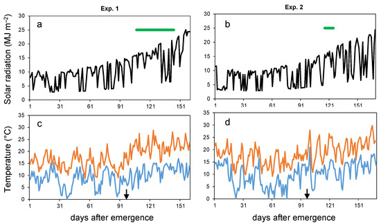 Dynamics of incident global solar radiation (a,b) and maximum and minimum daily air temperature (c,d) for Exp. 1 and 2. Black arrows indicate the beginning of flowering. Horizontal bars indicate the timing of the stress treatments.