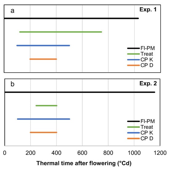 Thermal time from the beginning of flowering to physiological maturity (Fl-PM), timing of treatments (Treat) applied to canola in Exp. 1 (a) and 2 (b), and the critical periods (CP K) reported by Kirkegaard et al. (2018), and (CP D) by Dreccer et al. (2018) [,].