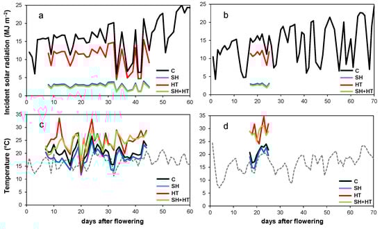 Incident solar radiation and maximum daily temperature were effectively modified by the treatments (Figure 3). As expected, the SH treatment reduced radiation incident on the canopy by 81%, the plastic (in roof and laterals) of the chamber in HT reduced the incoming direct solar radiation by 27%, and the combined SH + HT darkened the canopy by 83% (Figure 3). Consequently, cumulative incident solar radiation during the treatment periods was strongly reduced with respect to C (Table 1). There was a close relationship between incident and intercepted solar radiation in both experiments, as the LAI at flowering ranged 4.9–5.3 (data not shown) and it maintained a high light capture efficiency (>0.95) throughout the treatment period. Additionally, the chlorophyll content of the leaves stayed high (39–43 SPAD units) and the red/far red ratio of light at soil level was very low, ranging from 0.07 to 0.14 (data not shown).