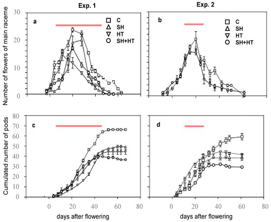 Dynamics of flowers in the main raceme (a,b) and cumulated number of pods (c,d) in Control (C), shading (SH), high temperature (HT), and combined stresses (SH + HT) in Exp. 1 and 2. Each point is the mean of 4 replicates ± 1 standard error. Horizontal bars indicate the timing of the stress treatments.