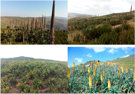 - Chala, D.; Brochmann, C.; Psomas, A.; Ehrich, D.; Gizaw, A.; Masao, C.A.; Bakkestuen, V.; Zimmermann, N.E. Good-bye to tropical alpine plant giants under warmerclimates? Loss of range and genetic diversity in Lobelia rhynchopetalum. Ecol. Evol. 2016, 6, 8931–8941. [Google Scholar] [CrossRef]