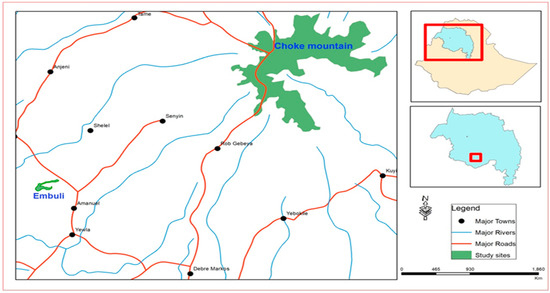 Seed collection was conducted in the Choke Mountain Range. The Choke Mountain Range is located in East Gojjam Zone in the Amhara National Regional State, Northwestern Ethiopia, approximately 332 km northwest of Addis Ababa. The mountain range extends from 10°34′ E to 10°46′ N and 37°47′ to 38°01′ E, and the highest peak is located at 10°42′ N and 37°50′ E. Choke Mountain is the water tower of the region, serving as headwater of the Upper Blue Nile basin where a total of 59 rivers and many springs are identified to originate from this mountain range [35]. The area is endowed with beautiful views (Figure 1).
