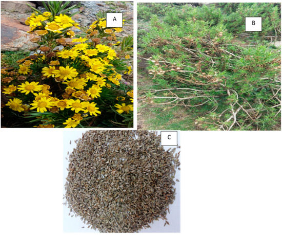 Euryops pinifolius: (A) flowering stage (November 2018), (B) fruit dispersing stage (December 2018), and (C) seeds. Source: photo by Sinework Dagnachew.