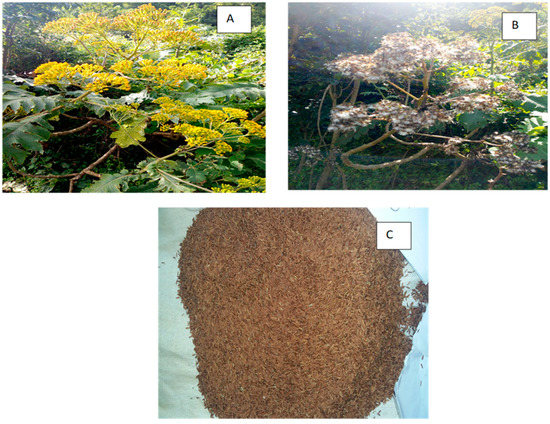 Solanecio gigas: (A) flowering stage (December 2018), (B) dispersal stage (January 2019), and (C) seeds. Source: photo by Sinework Dagnachew.