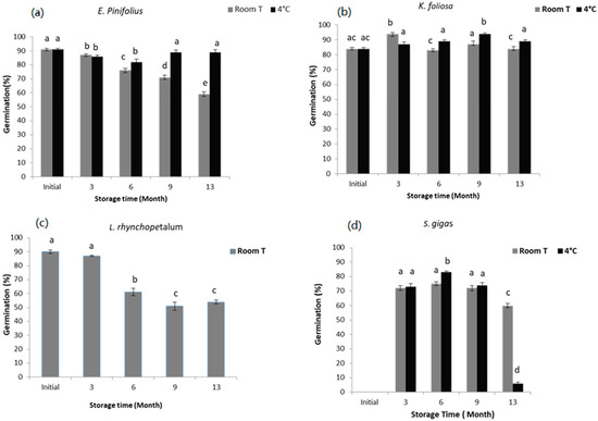 Effects of storage time and temperature on germination of seeds of (a) E. pinifolius, (b) K. foliosa, (c) L. rhynchopetalum and (d) S.gags before seed drying (vertical bars indicate the standard deviation). Error Bars marked with different letters indicate statistically significant difference (p < 0.05) according to Tukey test.